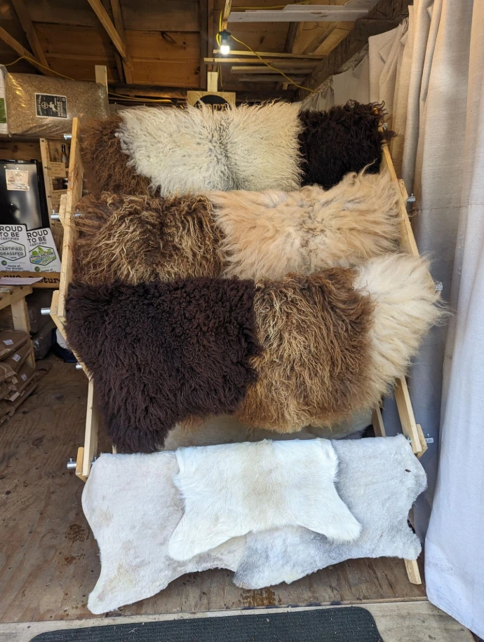 Sheep and goat skins are some of the nicest products we make from parts that, on a lot of farms, get thrown away. Like many things these days, there’s an industrial way of tanning and an older, slower, more expensive, natural way. The first uses caustic chemicals like formaldehyde and benzene, while the second uses tannins from tree bark. We’re happy to have paired with Vermont Natural Sheepskins (VNS), located (unsurprisingly) in Vermont.